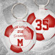 Den här enkla och personliga nyckelringen för fotboll har en realistisk bild av en fotboll som har röda och vita paneler, där du kan anpassa idrottsmannens namn, jersey-nummer, team och mascot namn och år framåt och i monogram eller fet brev bakåt - av katz_d_zynes