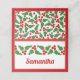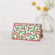 Julgruset bär mönster rött och grönt vikta eskort med rött gräns och gästernas namn.
