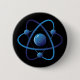 Knäppas att presentera en blått stylized atom på en svart bakgrund.