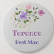 Vi presenterar den bästa mannen - ett Button-märke med namn och en illustration av blommigten. Identifieringsbricka för bröllop.