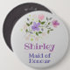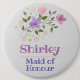 Vi presenterar Maid of honor - ett Button-märke med namn och en illustration av blommigten. Identifieringsbricka för bröllop.