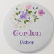 Inledning av Usher - ett Button-märke med namn och en blommigt illustration. Identifieringsbricka för bröllop.