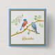 En knapp med en bild av en kvinnlig och manlig blåfågel. Bakgrund, bild och text kan vara personlig. Originalteckningar av W.B.