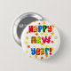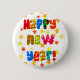 Ett nytt års Button eller Badge med Gott nytt år i flerfärgat brev och orange och gult börjar spridas över hela den vita bakgrunden. Från en handmålad papper kollagedesign av Judy Adamson.