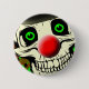 En illustration av en läskig skallclown ansikte med röd näsa och konstig grönt ögon tittar på dig.