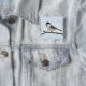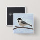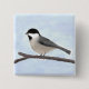 Pin-back-knapp med min ursprungliga digitala vattenfärgsillustration av en svart-kapslad Chickadee som trycks på en blyfri skevning mot en blek blå himmel.