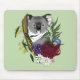 En söt koala-björn på en träd-extrem med blommor och eukalyptus löv i bakgrunden av grönt