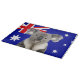 Håriget koala är en av Australiens medborgare. Den australiska flagga är i bakgrunden. De är lätt igenkännliga genom sin stela, svävande kropp och stora huvud med rund, fluffy öron och stor, spoonformad näsa.