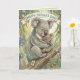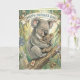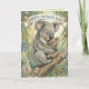 Denna charmanta illustration visar en hjärtlig morsdags scen med en koalamamma och hennes unge. Konsten har en mjuk, handmålad känsla med ömtåliga penseldrag och en dämpad, naturlig färgpalett i grå, gröna och turkosa nyanser.