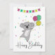Födelsedags hälsning Glad födelsedag med ballonger och koala för barns födelsedag. Ett roligt, färgglatt kort för ett barns födelsedag. För vänner som älskar koalas.