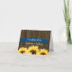EN SOLROS TACKKORT MED LANDFULL CHARM OCH EN RUSTIK KÄNSLA MED EN TRÄSTRUKET TRÄSTAKET ELLER TUNNA DESIGN OCH EN SPIKHUVUDTRIM. LÄGG TILL EGEN TEXT PÅ DET KOBOLDBLÅ NAVY TRYCKTA BANDEROLEN OCH DITT NAMN ELLER NAMNEN PÅ EN BRUD OCH/ELLER BRUDGUM UNDER. EN BUKETT AV GYLLENE GULA SOLROSOR HAR EN VINTAGE OCH MÅLERISK UTSMYCKNING. DESSA KOMPLETTERAR EN BRÖLLLOPPS- ELLER MORS DAG- FÖRSAMLING ELLER NÅGON ANNAN SÄRSKILD TILLFÄLLE MED EN LADUGÅRD, GÅRD ELLER BONDEGÅRDSTEMA. SOLROSOR I INNERKOR