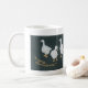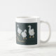 En snyggt vit kaffe mugg med tre julgäss på svart bakgrund med guld och silver, från en handmålad design av Judy Adamson. Matchande gratulationskort finns också tillgängligt.