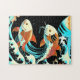 This Asian inspired koi fish jigsaw puzzle is influenced by the fine art Great Wave off The Great Wave off Kanagawa by the artist Hokusa from as well as Japanese comic style. The Great Wave lifts up the fish in a yin yang swirl, with Mount Fuji in the background. The primary colors are a turquoise aqua blue, deep orange, black, and cream, with some half tone dotted patterns to emulate comic book style. This puzzle would be a great addition for game night, a gift for a family member, after school activity, or senior living facility.