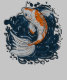 En levande koifisk med orange och vita skalor simmor som roar sig mitt i snurrande mörk blått vatten. Den dynamiska rörelsen i vatten skapar en energisk bakgrund som belyser fiskens elegans.