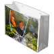 Färgfull karpfisk eller koifisk i en grunda trädgårdsdamm.