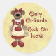 "Bara Cowards Cook på låg!" Lustigt talesätt för hobbykockar eller krokar efter yrke. Wordart i finare och en söt björn mamma med röd klänning med en apron och med sig verktyg i hennes handel. En humoristisk design för din favoritkock!
