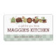 En hög med krukor, pannor, matlagningsredskap, pitchers och kopp i grönt och brunt på affärskort, livsmedelsetiketter eller "från köket av"-klistermärken eller catering-etiketter, recept-bindemedel, recept-kort och annat för köksmässor, matlektioner, catering eller catering samt andra matvaror eller matvaror...