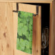 Grönt kökshandduk av klöver, färsk kökshandduk. Regndroppar på schampköket trasa.