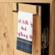 Den här kökshandduken visas i safithblått och pläterad med tankrengörad rand. Ord av "Skrydda med krydda och allt gott" visas i rött. Visas på en vit handduk med julgingerbrödstaccenter. Anpassa det här objektet eller köp som designat.