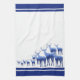 Kökshandduk som visas i vitt med söt blåfärgad hjort/älk som går över grund kant i ena änden bara som om de går ut i avstånd. Sapphire Blue accent rand på båda sidor.