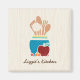 Lägg till ett litet hemlighetsmakeri i ditt kök med den här söta magneten land stil som innehåller en uppsättning träskedar och köksredskap i hand plockade i en turkospak omgiven av ett fint rött äpple och färsk frukt. Den här köksdesignen i land har en lätt bakgrund av trä mönster.