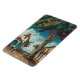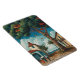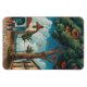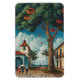 Fantastisk målning från en kolonialby där en stor tropisk träd och tre personer går till havs
