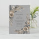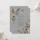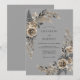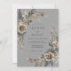 Denna design har en sofistikerad grå bakgrund prydd med dämpade champagnejrosor och koltonad lövverk. Ömtåliga ormbunksblad och eleganta bladrika kvistar skapar ett graciöst botaniskt arrangemang. Den akvarelliska estetiken frammanar en tidlös och stämningsfull atmosfär perfekt för ett formellt vinter- eller höstevenemang.