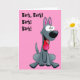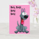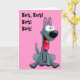 Den grå hund på framsidan och insidan av detta kort. "Bark!" överst på framsidan och "elaken kommer snart" in.