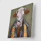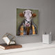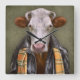 Denna design presenterar ett porträtt av en ko i en läderjacka och scarf.