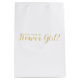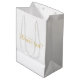 "Kommer du att bli min blomma flicka?" Modern Script White och Guld Gift Bag med titeln "Kommer du att bli min blomma flicka?" i guld, det moderna skriptteckensnittet stil på vit bakgrund. Obs! Folidinformationen simuleras i teckningen. Ingen folie kommer att användas under tillverkningen av denna produkt.
