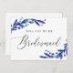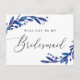 Elegant vattenfärgsblått marint blommigt, skript "Kommer du att vara min bridesmaid?" kort.