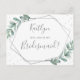Det här toppen söta vykortet är perfektens sätt att fråga "kommer du att bli min brudgumm?" Utformningen har en chic silver-folie geometrisk ram med typografi av trendiget och lush-vattenfärgen eucalyptus greenery. De här vykorten är lätta att anpassa och kan användas för att be dina kära om att vara din brudgumm, din mässa eller hedersbetygelse, din blomma etc.