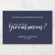 "Kommer du att bli min Groomsman?" Modern skribentblåsande vin-etiketter med texten "Kommer du att vara min Groomsman?" i vitt, modernt skript, stil med detaljer i vitt, modernt sans serif-teckensnitt på marin blå bakgrund.