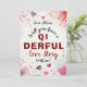 Det här udda och lekfulla Alla hjärtans dag-kortet har den kvicka frasen "Vill du ha en underbar kärlekshistoria med mig?" på framsidan, vilket ger ett skvätt humor till ditt hjärtliga budskap. Bakgrunden är prydd med mjuka, akvarellhjärtan som skapar en mjuk och romantisk stämning. Personliggör kortet med din älskades namn för en speciell, anpassad touch, och lägg till din egen signatur "Med kärlek, [Ditt Namn]" på baksidan. Perfekt för par som uppskattar en rolig, smart twist på traditionella Alla hjärtans dag-kort.