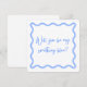 Öka ditt brudgumm frieri med vårt charmerande "Kommer du att bli min något blå?"-kort. Perfekt för coolan, broder, det här kortet har en vit, handritad gräns i en mjuk blå nyans, som elegant sätter upp den hjärtliga frågan för din blå besättning. Det lekfulla, handskrivna teckensnittet tillför en aning modern charm. Detta kort omfattar inte bara det traditionella "något blått" bröllop inslag, utan det är också utmärkande för dess chic och tidlösa utformning. Få dina brudar att känna extra speciellt med denna minnesvärda och snyggt frieri.