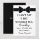 Tänker du be någon att bli din best man på ditt kommande bröllop, då kan du välja dessa klassiska svarta bow tie best man-kort. Denna anpassade inbjudan får din vän, bror, kusin, systerson, son eller vem du än väljer att känna sig extra speciell. Inbjudan kan enkelt anpassas genom att klicka på knappen "Anpassa" under bilden där du kan ändra text, teckensnitt och storlek.
