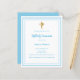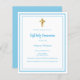 En vit bakgrund, dekorerad med himmel blå ram och ett gyllene kor personaliserat och lägg till namn och detaljer. Blå text. 1 lakan = 1 inbjudan tryckt kant till kant.