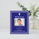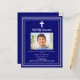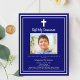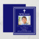 En marin blå bakgrund, dekorerad med ett vitt ram och ett vitt kor personaliserar och lägger till ett foto namn och detaljer. Vit text. 1 lakan = 1 inbjudan tryckt kant till kant.