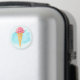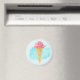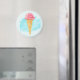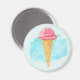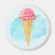 En yummy magnet med en utsökt glasskoneillustration, med en skop av rosa jordgubbsmassa som hålls av en våffelkon. Ställ in på en vattentblått färgstänk/penseldrag.