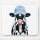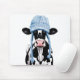 I illustrationen visas en svart och vit ko som bär en blå vinterhatt med öronflagor och hjärnor. Bilden kombinerar inslag i land med en humoristisk tvist som skildrar kon i ett oväntat stil, vilket ger bilden en unik charm.