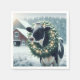 En ko står i ett snöslandskap med en julkrans runt nacke som lyfts upp av glatt glödande ljus