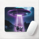 Mysterisk scen för en UFO som lyfter en ko i ljusstrålen mot bakgrund av en natt himmel med en fullt måne. Perfekt för fläkt i science fiction och fantastiska historier om kontakter med utomjordingar.