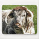 En fotografisk utformning av en engelsk Longhorn-ko, en brun och vit nötboskap.