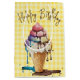 Att köra glasskon med sprinkles på gult och vit gingham-bakgrund för födelsedag.