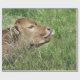 En vacker, söt kalv som ljuger i ett långt gräs med tunga som sticker ut.