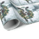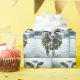 En svart och vit ko på vintern som bär en helgdag med ljus
