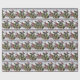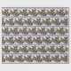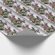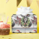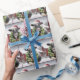 En svart och vit ko som står på en vinterbarnyard och bär en helgdag med glansande ljus och en röd båge täckt i snö.
