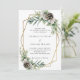 För ett vinterbröllop. En vit bakgrund som dekorerats med koner, vita bär och grönsaksbär. Ett faux guld geometric ram. Anpassa och lägg till namn och information.