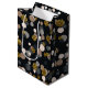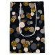 Ett mönster av slumpmässiga konfektytor i en pastellpersika, äppelbrun och grått palett, med guld glitter mot mörkens bakgrund.