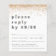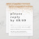 Guld Glitter Konfetti-skript, Bröllop OSA. Ett budgetmässigt prist mindre än 4,5 x 5,6 tum alternativ. Finns i ett SEMI GLOSS 110 lb-kort LAGRAR, vilket är standardalternativet (rekommenderas för inbjudningar), ELLER SATIN AVSLUTAR 80 lb PAPPER LAGRAR (perfekt för bilagor). Kuvert är ett extra som tillval och är något större än det storleka kortet. Huvudet är stort nedanför i gemener av snyggt med detaljerna vid grund, med guld faux glitter gräns överst på vardera sidan. Anpassa texten till dina egna detaljer.